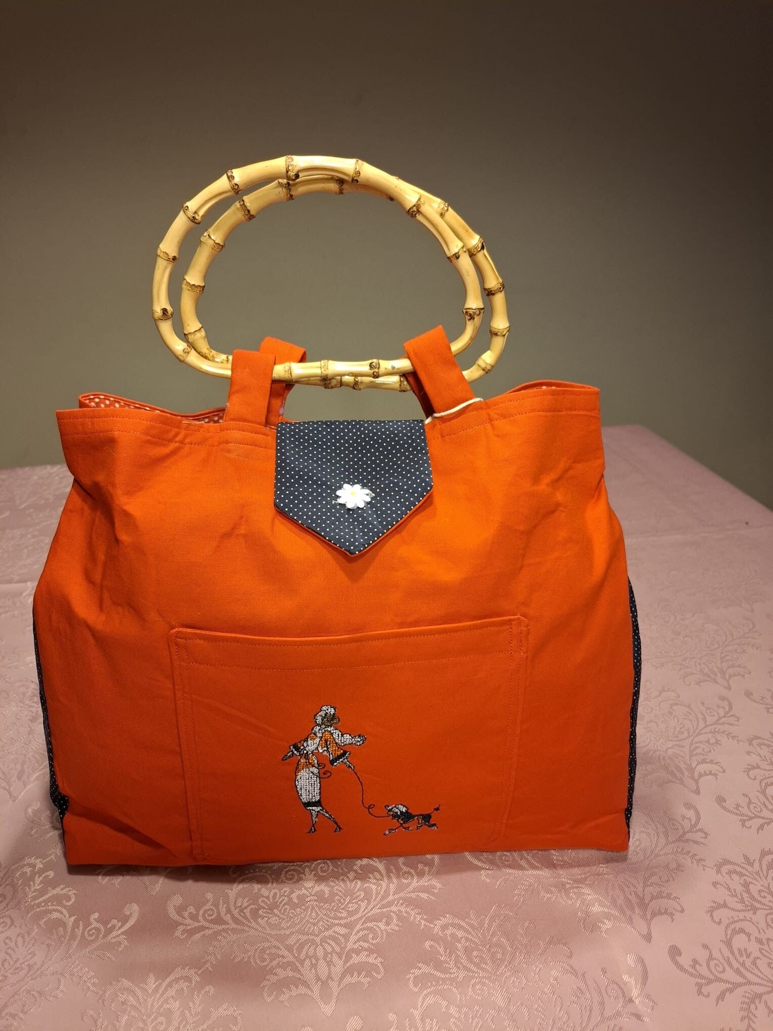 Sac à main unique, résistant, différentes poches à l'intérieur.